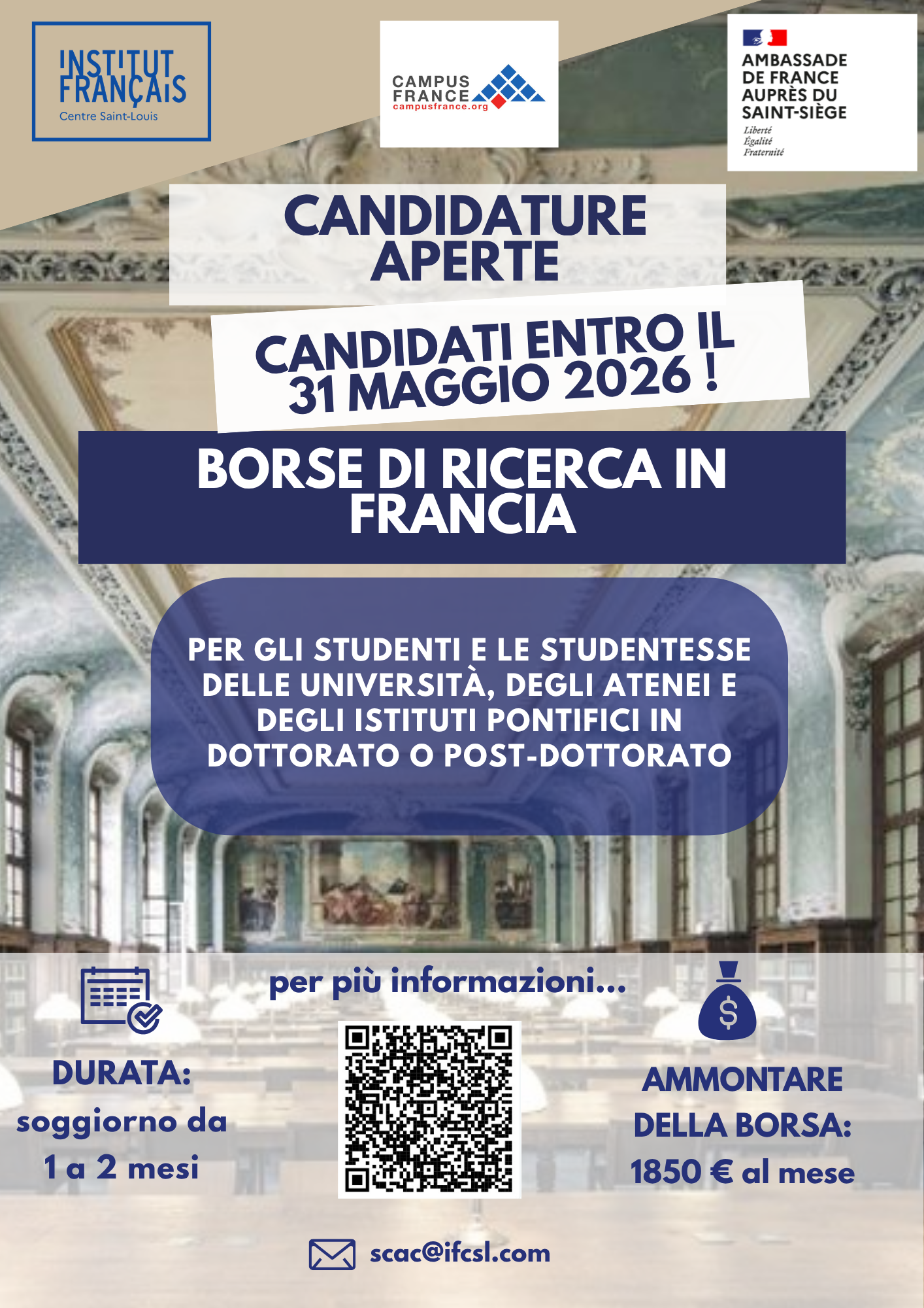 Il Servizio Culturale dell’Ambasciata di Francia presso la Santa Sede, l’Institut français - Centre Saint-Louis, offre un programma di borse di ricerca attraverso Campus France, un operatore sotto la supervisione del Ministero dell’Europa e degli Affari Esteri. Il bando è riservato a studenti di dottorato e post-dottorato di università, atenei e istituti pontifici romani.