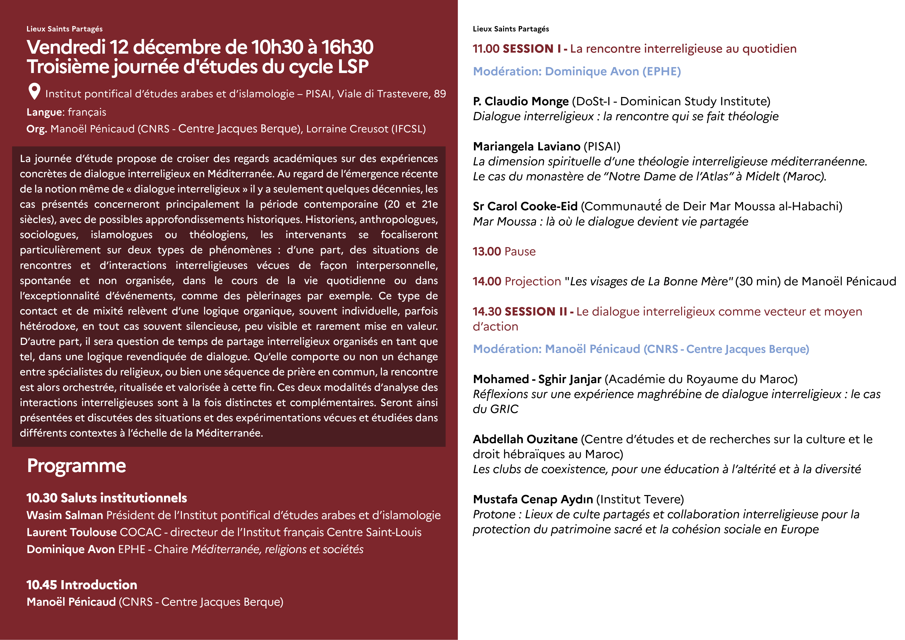 Per la terza giornata di studio del ciclo di conferenze intorno alla mostra Luoghi Sacri Condivisi (Villa Medici, 09.10.25 – 19.01.26),vi aspettiamo per una giornata di riflessione e di testimonianze sul soggetto delle esperienze concrete di dialogo interreligioso nel mondo mediterraneo, grazie alle contribuzione di attori universitari e del campo. Questa giornata di studio, presso il PISAI - Pontificio Istituto di Studi Arabi e d’islamistica ci permette di riunire due initiative che sviluppano ricerche nell’ambito del bacino Mediterraneo; la mostra Luoghi Sacri Condivisi e la Cattedra Universitaria Mediterraneo, religioni e società, frutto di una collaborazione congiunta tra il PISAI et l’Institut français Centre Saint Louis, per chi la giornata fa parte del suo agenda accademico 2025-2026.