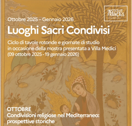 La mostra, Luoghi Sacri Condivisi : Un viaggio tra le religioni, mette la luce su la portata di un fenomeno religioso trascurato e molto presente nel mediterraneo: i luoghi sacri condivisi tra i fedeli dei tre monoteismi. Il percorso della mostra invita a un viaggio serpeggiando tra sette capitoli, i visitatori scopriranno le città, mari, giardini, grotte, montagne, oggetti, e opere di architettura dove la condivisione del sacro diventa visibile. Le opere presentate sono una testimonianza dei legami storici, culturali, artistici e spirituali di dialoghi e di pratiche per chi il bacino mediterraneo è stato un terreno fertile. Per ulteriori informazioni sulla mostra vi invitiamo a riferirvi alla pagina web della Villa Medici.