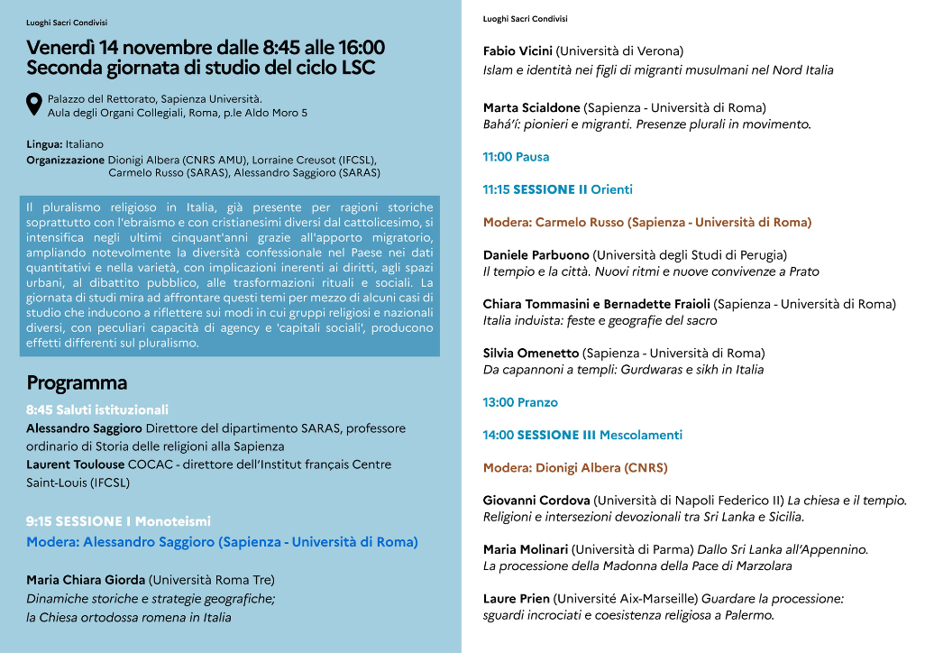 Il ciclo di conferenze e di giornate di studio organizzate nell’ambito della mostra Luoghi Sacri Condivisi (Villa Medici 09.10.25 - 19.01.26) continua a novembre con il tema: Pluralismo religioso e migrazioni in Italia. Per il secondo incontro del ciclo, una giornata di studio riunirà presso la Sapienza et il dipartimento SARAS (Storia, Antropologia, Religioni, Arte, Spettacolo) ricercatori da diverse università italiane e francese.