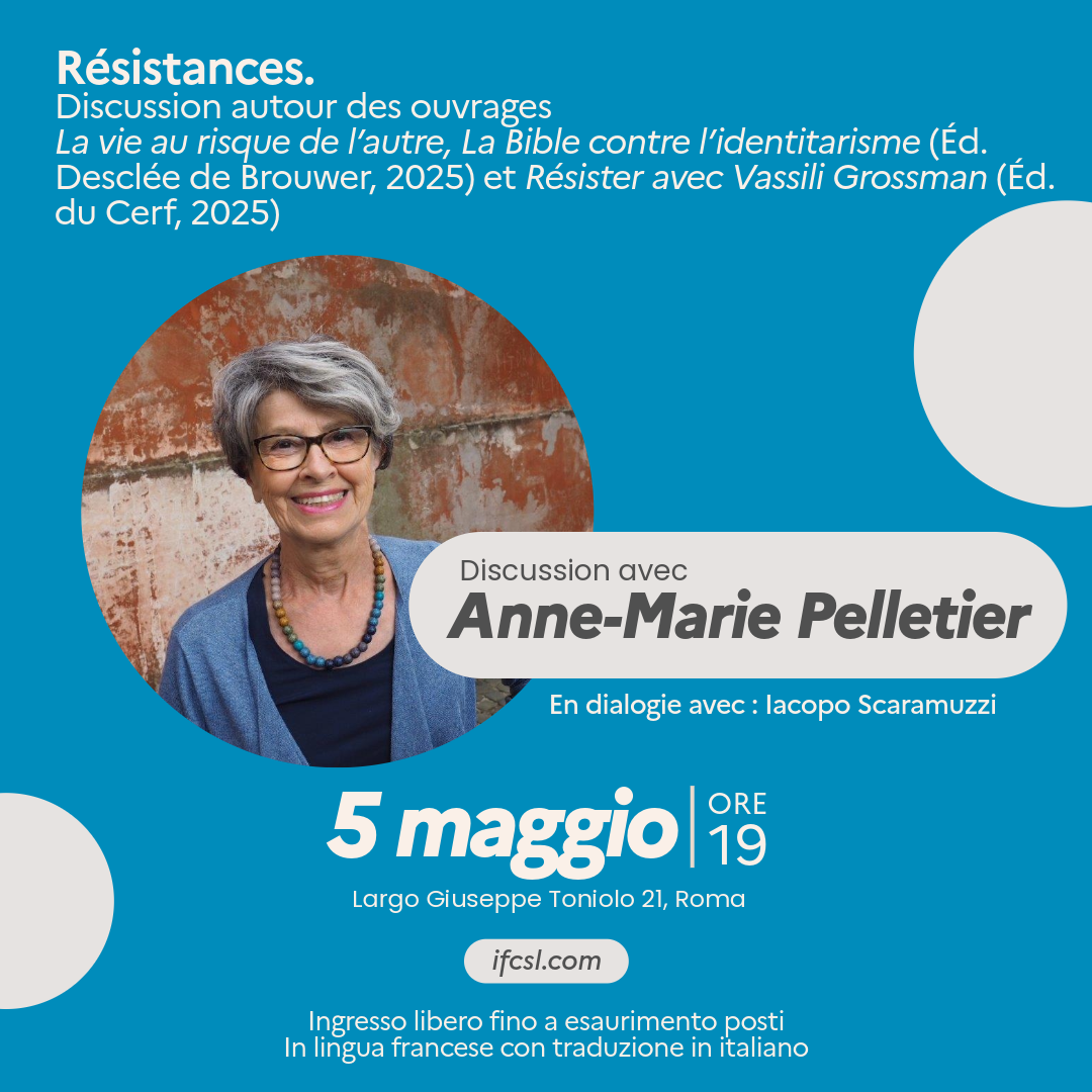 In dialogo con il vaticanista Iacopo Scaramuzzi (La Repubblica), Anne-Marie Pelletier interverrà all’IFCSL martedì 5 maggio alle ore 19 sul tema della resistenza spirituale attorno ai suoi ultimi due libri: Résister avec Vassili Grossman (Les Éditions du Cerf, ottobre 2025) e Vivre au risque de l’autre : la Bible contre l’identitarisme (Ed. Desclée de Brouwer, aprile 2025).