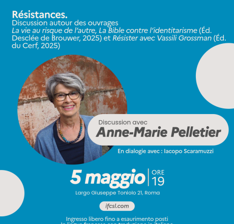 Présentation d'ouvrages Resistenze. Une discussion con la teologa e biblista Anne-Marie Pelletier 05 Maggio, 19:00 In dialogo con il vaticanista Iacopo Scaramuzzi (La Repubblica), Anne-Marie Pelletier interverrà sul tema della resistenza spirituale (...)
