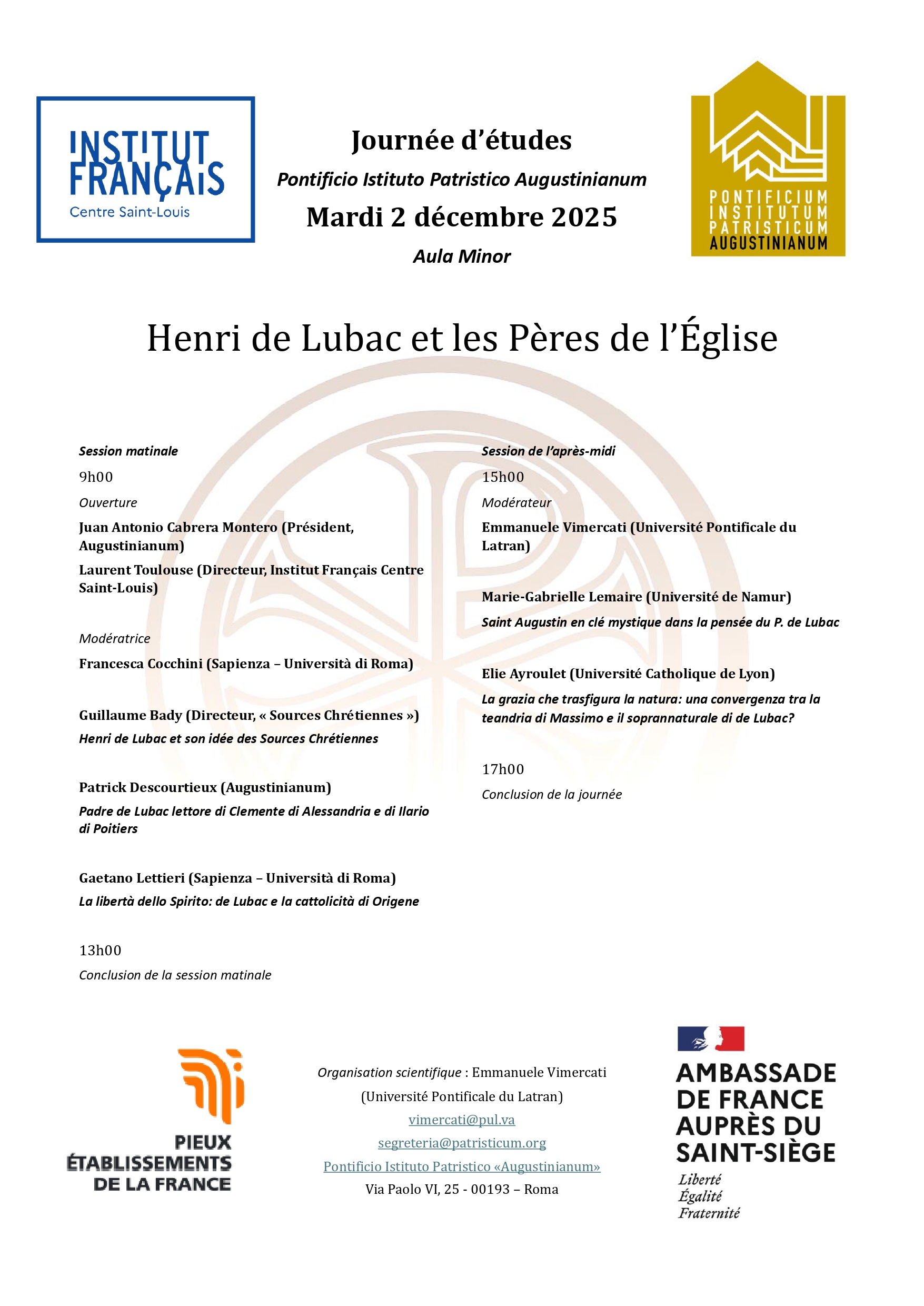 Henri de Lubac fut l’un des plus grands théologiens du XXe siècle. L’un des aspects les plus originaux de sa pensée était son intérêt renouvelé pour le développement de la tradition de l’Église, en particulier à ses origines. C’est dans ce contexte que s’inscrit l’attention qu’il portait aux Pères de l’Église, qu’il considérait comme la source vivante de la tradition ecclésiastique et un point de référence fondamental pour la construction de la doctrine chrétienne. La co-fondation de la collection « Sources Chrétiennes », qui reste aujourd’hui un outil indispensable pour l’étude des Pères, témoigne de manière indélébile de cette attention. Dans cette ligne, la journée d’étude est le fruit d’une collaboration entre l’Institut Français Centre Saint-Louis, qui a toujours promu la figure de de Lubac, et l’Institut Pontifical Patristique Augustinianum, centre d’excellence pour l’étude des Pères. La journée explorera certains aspects principaux de l’interprétation des Pères dans la pensée de de Lubac : des spécialistes de langue française et italienne discuteront et fourniront des repères utiles à la compréhension du christianisme des origines, de la pensée de de Lubac, mais aussi du débat philosophique et théologique actuel.