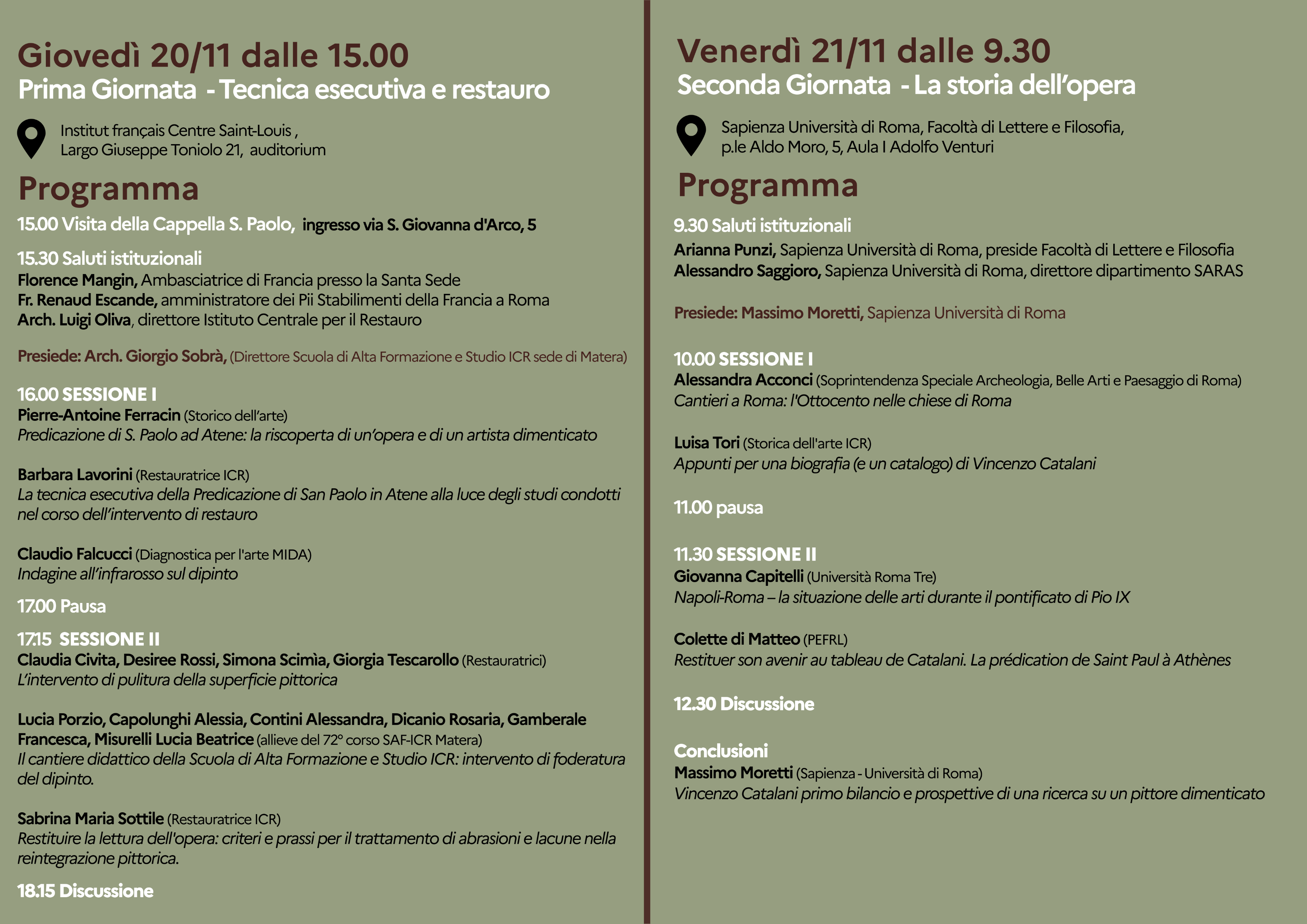 Saint Paul à l’Aréopage d’Athènes de Vincenzo Catalani (1814-1871) est une oeuvre avec un parcours atypique, hors des musées, trouvée dans le grenier de L’Église Saint-Louis des français, prise pour un tapis puis entreposée dans les escaliers de l’orgue. Elle nous dévoile finalement ses secrets, l’un après l’autre. C’est l’histoire d’un tableau, d’une œuvre d’art, mais aussi de celle de son auteur, maître oublié dans les couloirs de l’histoire. Représentant de son siècle, entre fin et commencement, Vincenzo Catalani est une figure qui requiert notre plus grande attention.